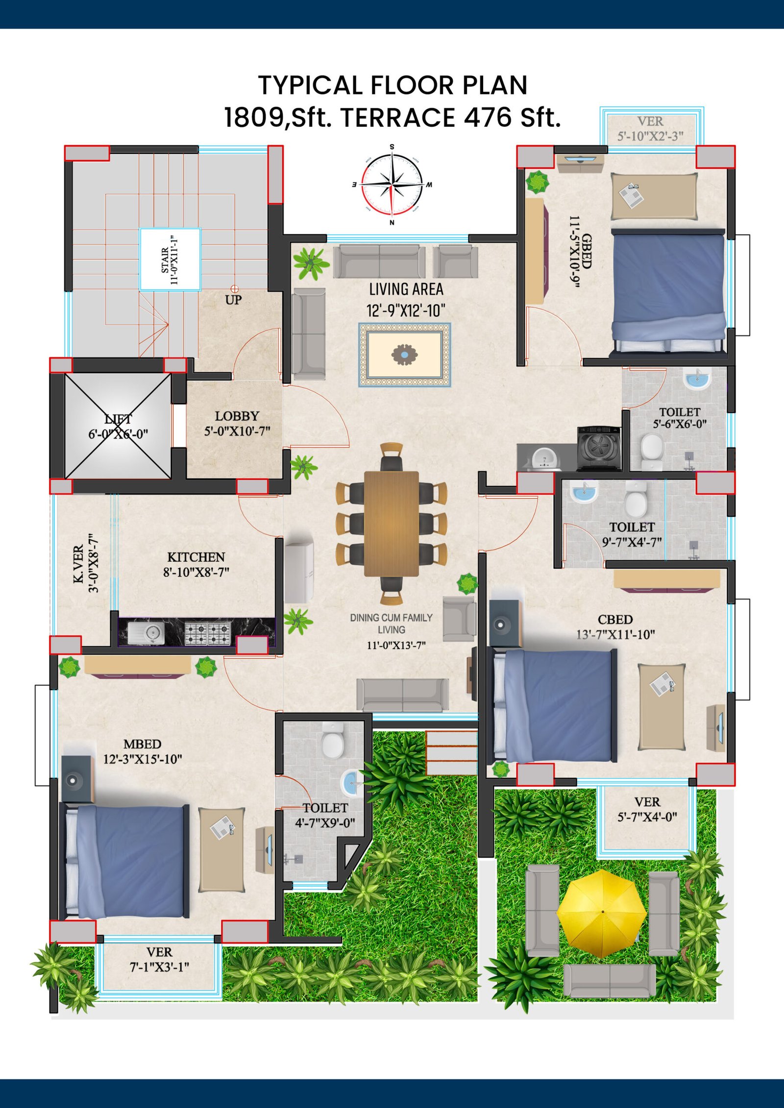 Community Space, Plantation, Cloth Drying Area, Machine Room at Roof-top.