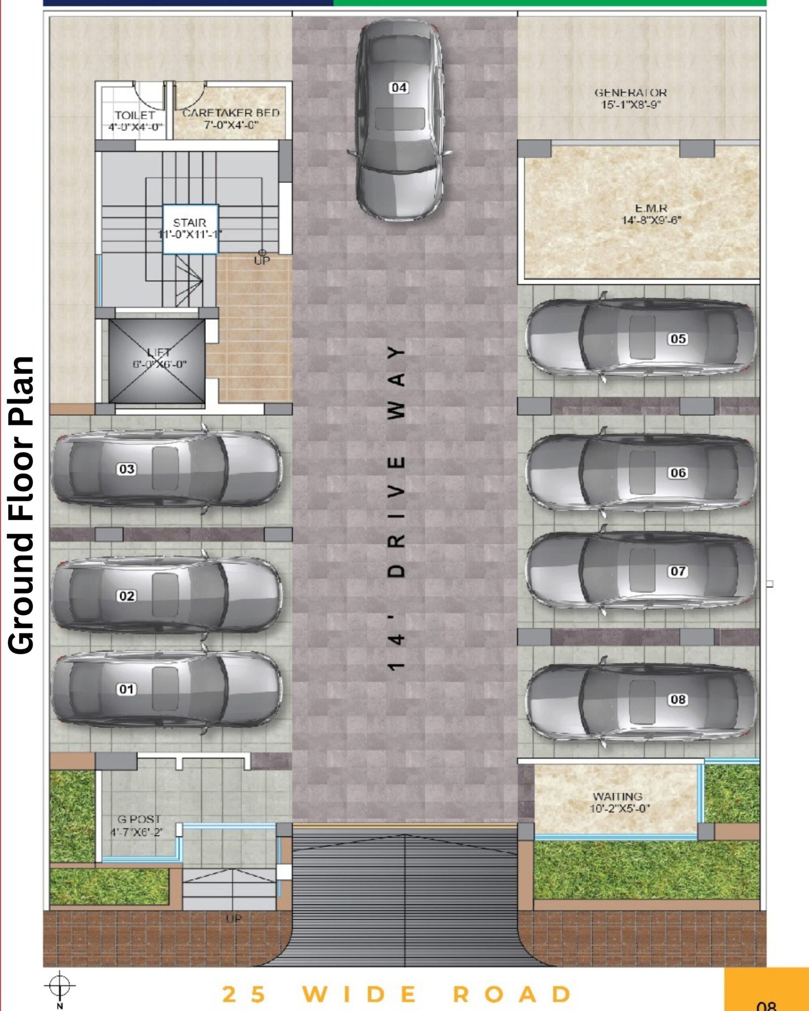 Waiting, Garden Space, Guard Post, Generator Room, Sub-station, Guard Accommodation at Ground Floor.